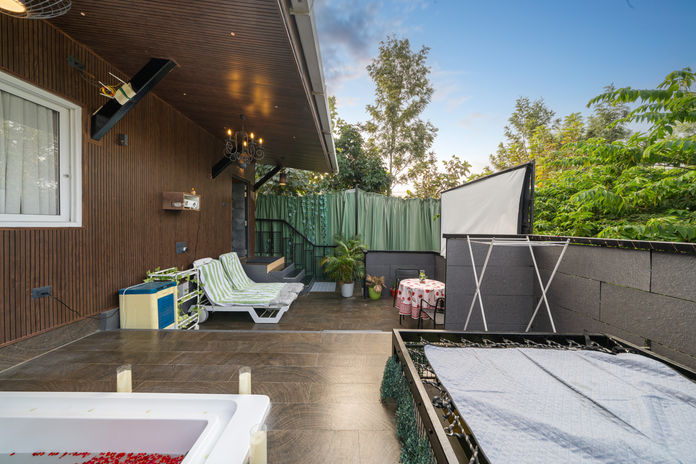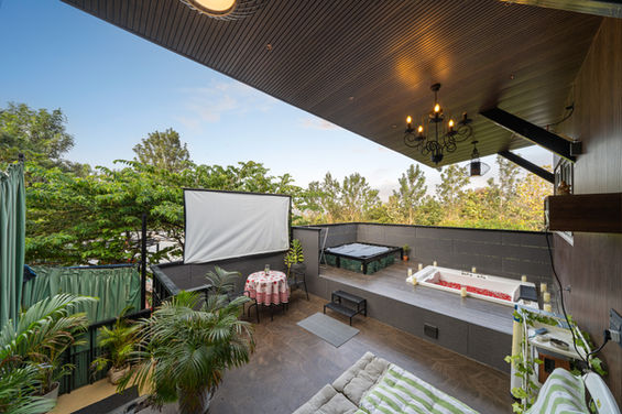 HIDECK Signature is a 300 sq. ft. private studio featuring 1 bedroom, a 400 sq. ft. open deck with a heated Jacuzzi, loungers, and a private projector, perfect for couples. (Pet friendly)